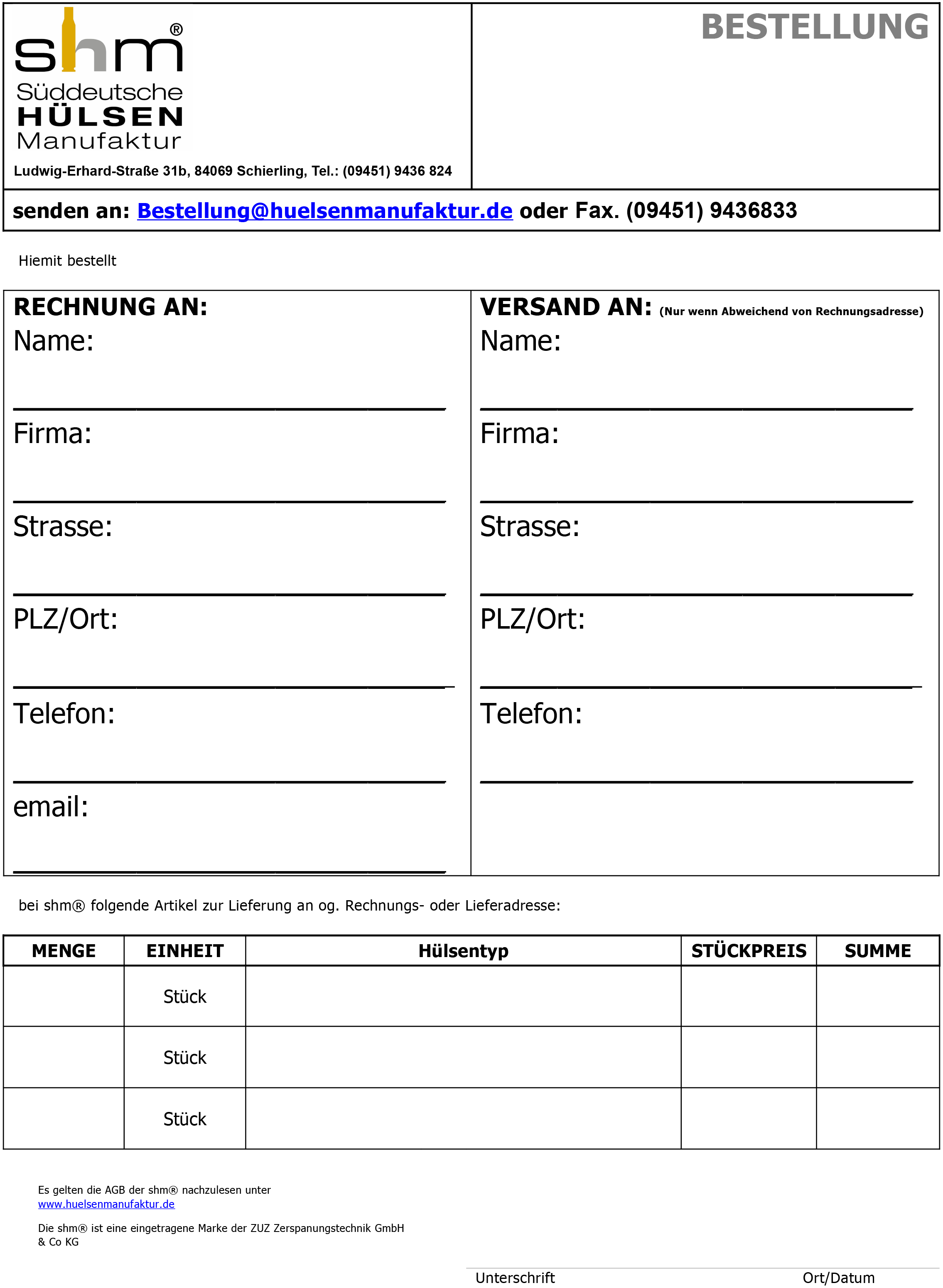 Bestellungen richten Sie bitte unter Verwendung unseres Bestellformulars vollständig ausgefüllt per Fax oder Mail an folgende E-Mail-Adresse oder Rufnummer: info@huelsenmanufaktur.de | Fax: 0941/91069887